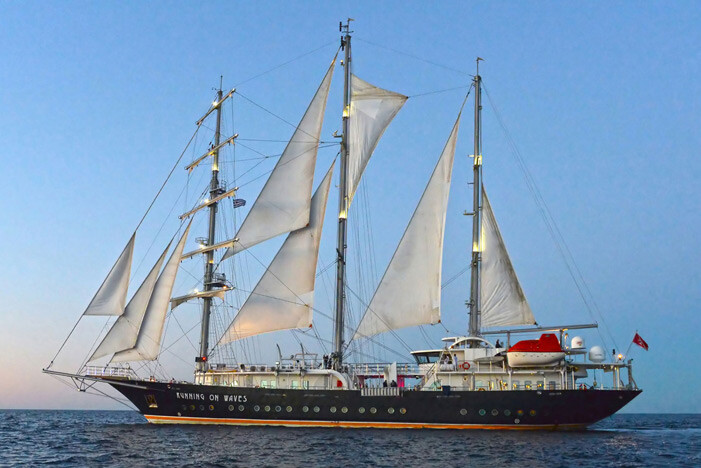 De elegante Running on Waves is ideaal voor een cruise langs de Griekse Cycladen. De majestueuze driemaster heeft een maximale capaciteit van 34 passagiers. Het interieur is, met een knipoog naar de art deco, aangekleed met edele materialen, mahoniehout, leer en teak. De bemanning van 21 personen zorgt voor het comfort van alle passagiers.Na elke excursie worden de passagiers aan boord verwelkomd met enkele attenties, zoals verfrissende handdoeken of koude drankjes. Achteraan het schip kan men rechtstreeks het water in voor een verfrissende of ontspannende duik.
